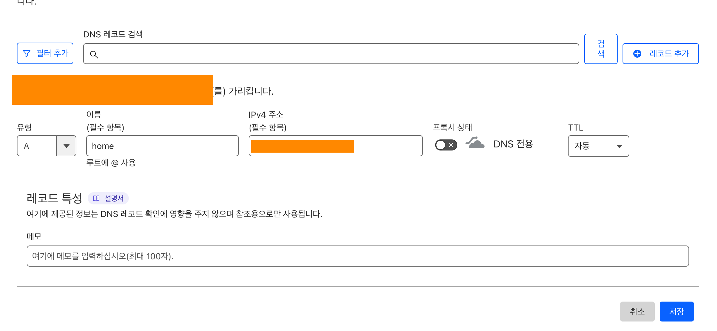 - Proxy 상태: "DNS only"로 설정 (클라우드 아이콘이 회색 상태여야 함).