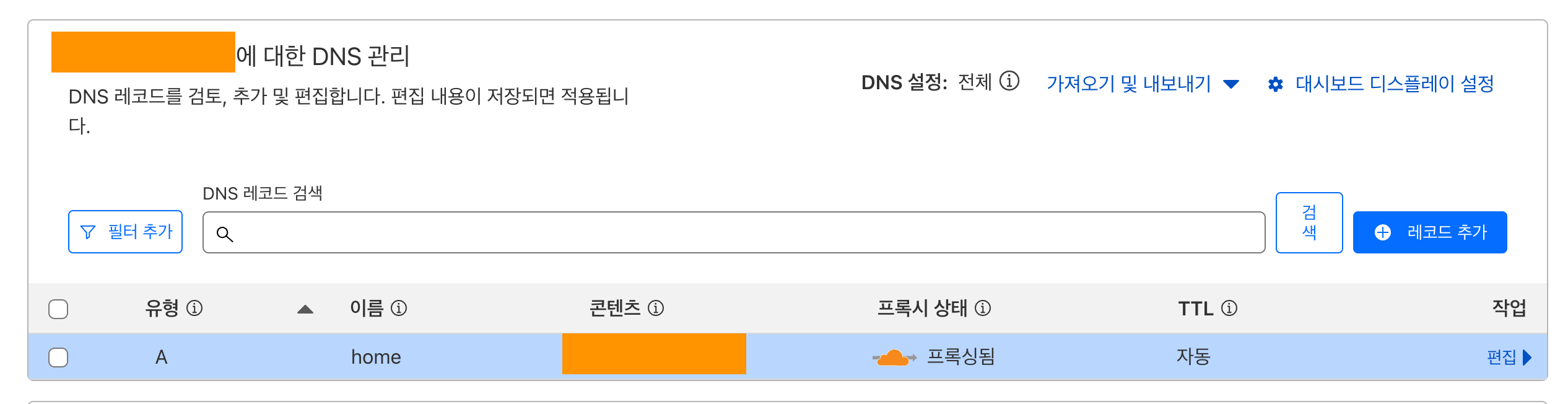Cloudflare의 프록시 기능을 활성화하면 도메인 조회 시 Cloudflare의 IP가 표시되고, 실제 홈서버의 IP는 감춰집니다.