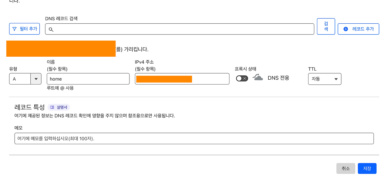 - Cloudflare 프록시를 활성화하지 않은 상태(DNS 전용)라서 보안 위험이 있음.